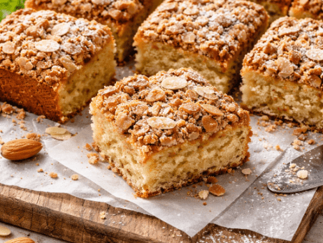 Združitev mandljeve in kokosove moke poskrbi za rahlo, zračno in sočno strukturo, hrustljav posip iz mandljev in cimeta pa je najlepši način, da si zaželiš: »dober dan!«