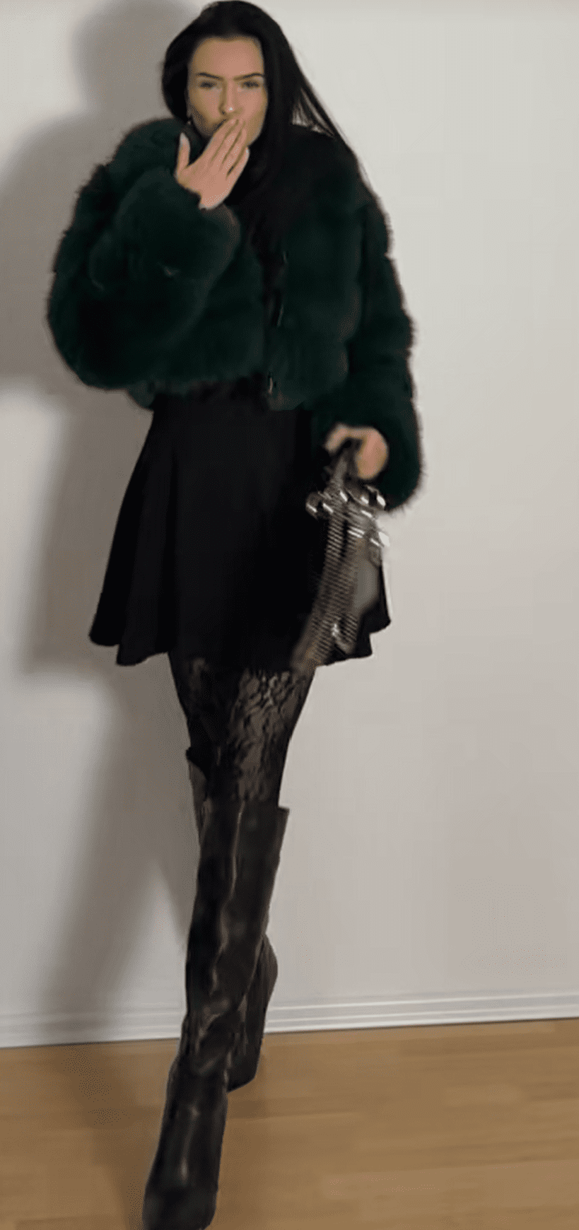 Trendi zimska kombinacija: mini krilo, čipkaste nogavice in škornji