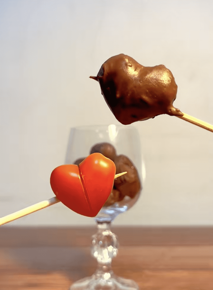 Češnjev paradižnik prerežite na polovico in ga z zobotrebcem ali palčko povežite v obliko srca. Nato skozi sredino potisnite paličico, da ohrani srčkasto obliko. V posodi stopite čokolado, nato pa potopite paradižnike na paličicah v čokolado. Čokolado lahko ohladite v ledeni vodi ali pa jo za 15 minut postavite v zamrzovalnik. Rezultat je neverjeten, okus pa nekaj, kar vas zagotovo ne bo pustilo ravnodušnih.