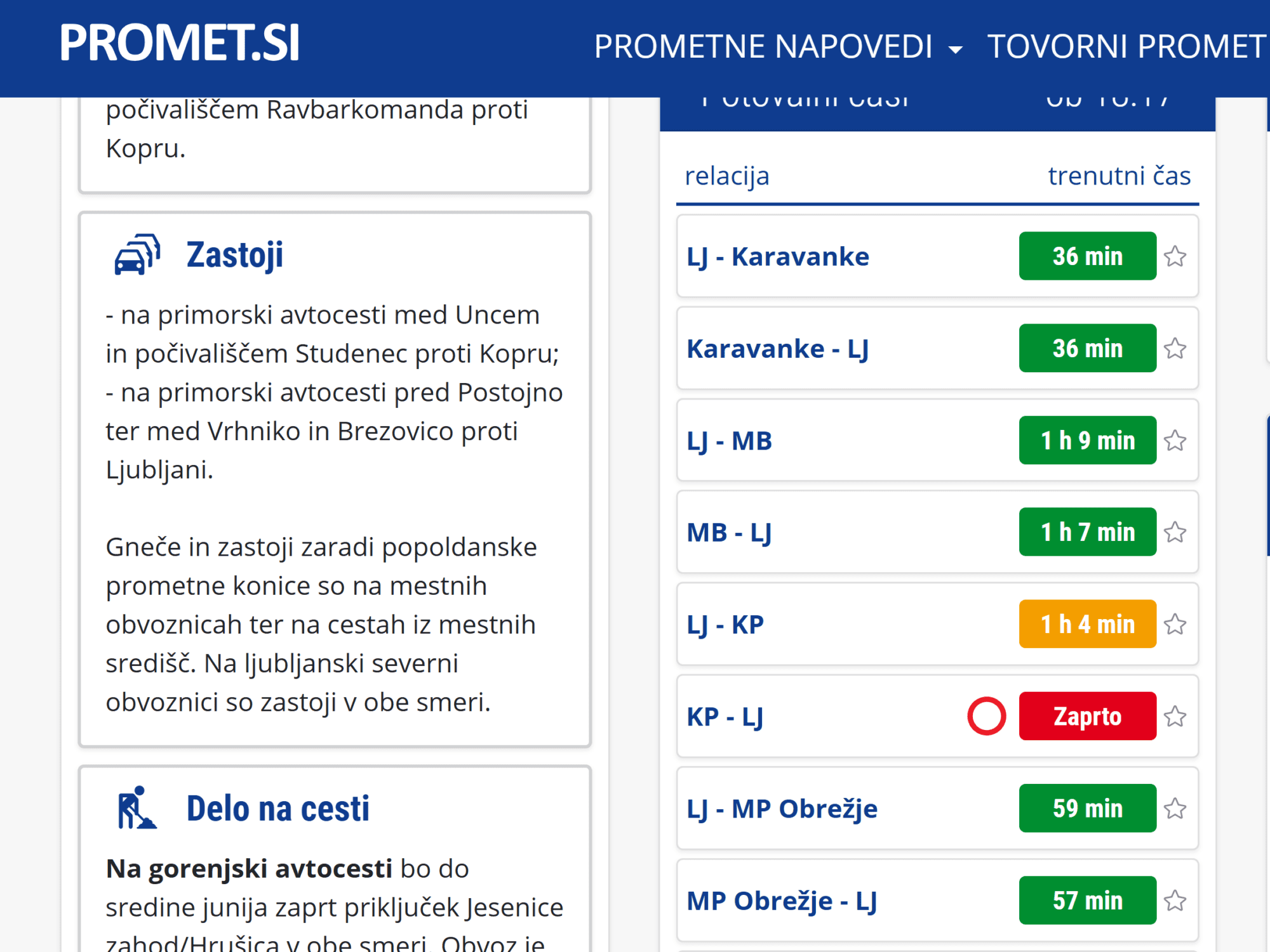 Na primorski avtocesti so bili na posameznih odsekih med Uncem in počivališčem Studenec proti Kopru zastoji, predvsem tovornih vozil. Zastoji so bili tudi na primorski avtocesti pred Postojno ter med Vrhniko in Brezovico proti Ljubljani.