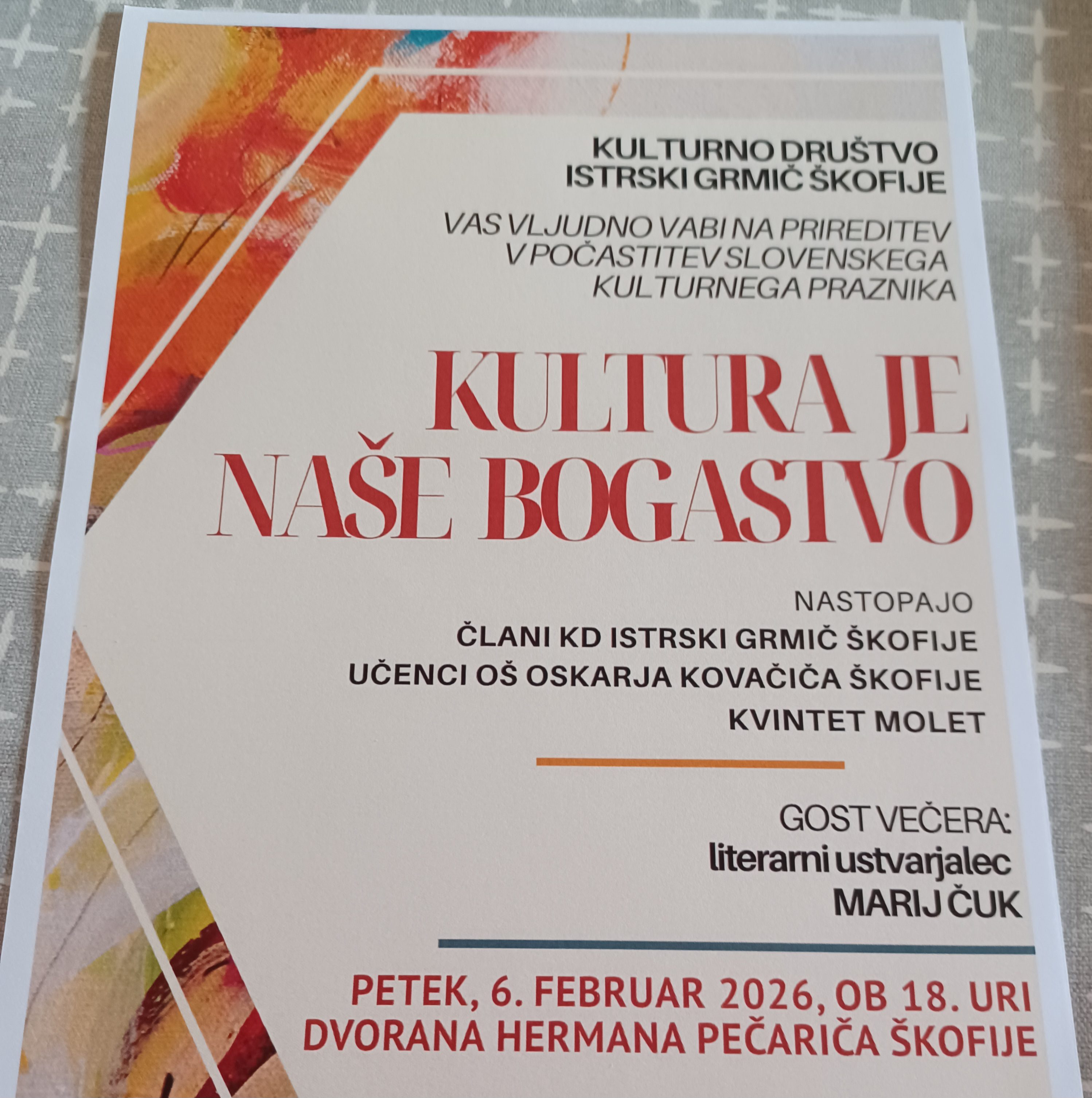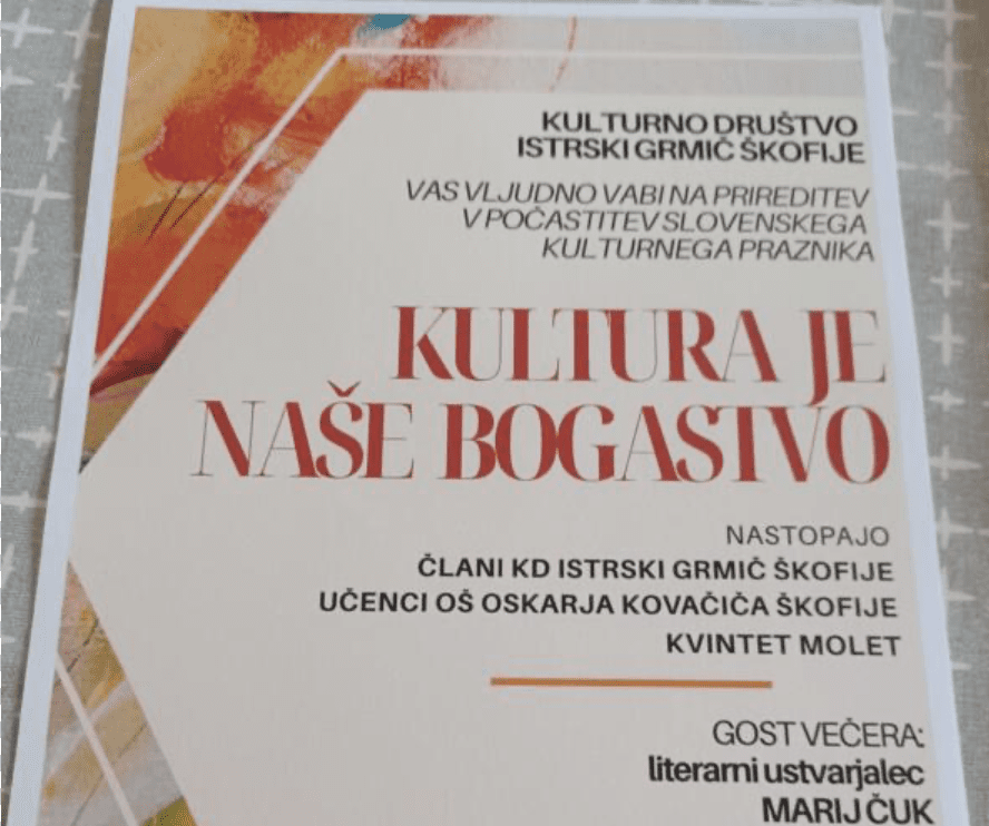 Prireditev je posvečena slovenskemu kulturnemu prazniku. S pesmijo, besedo in glasbo se bodo predstavili člani KD, učenci domače šole in Kvintet Molet.