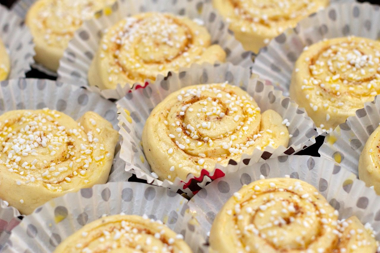 Rolice premažite z jajcem in po želji posujte s perlicami sladkorja. Pecite pri 200 °C 15–20 minut oziroma dokler ne postanejo zlato rjave.