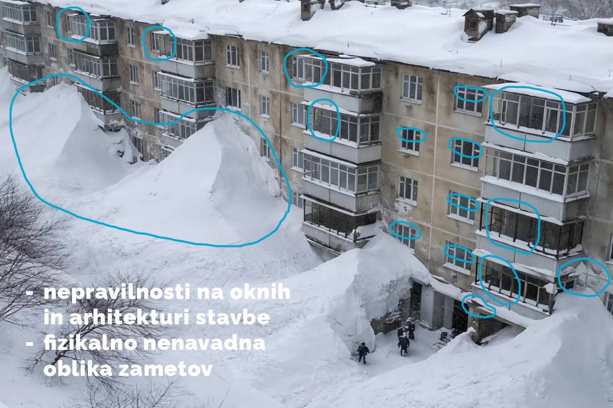 ▸ 𝗣𝗼𝘇𝗼𝗿𝗻𝗼𝘀𝘁 𝗻𝗮 𝗱𝗲𝘁𝗮𝗷𝗹𝗲 𝗻𝗮 »𝗽𝗼𝘀𝗻𝗲𝘁𝗸𝗶𝗵« – nenavadne oblike, popačenja in nekonsistence (npr. okenske prečke, stopnice se nelogično zaključijo, nenavadno oblikovani avtomobili ali stavbe, nelogično napeljani kabli na daljnovodih, nenavadna oblika človeškega ali živalskega telesa ipd.).