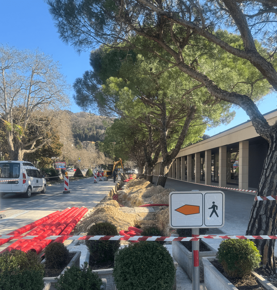 “Dela se začenjajo pri trafo postaji »Plaža«, skriti za stavbo krajevne skupnosti, nato pa se trasa nadaljuje po pločniku navzdol proti morju. Gre za infrastrukturni poseg, ki je nujen za posodobitev in oskrbo prenavljajoče se stavbe na naslovu Obala št. 14, na katerem trenutno poteka celovita obnova. Objekt je v lasti podjetja Grafist, ki nastopa tako kot investitor kot tudi izvajalec del”, dodajajo.