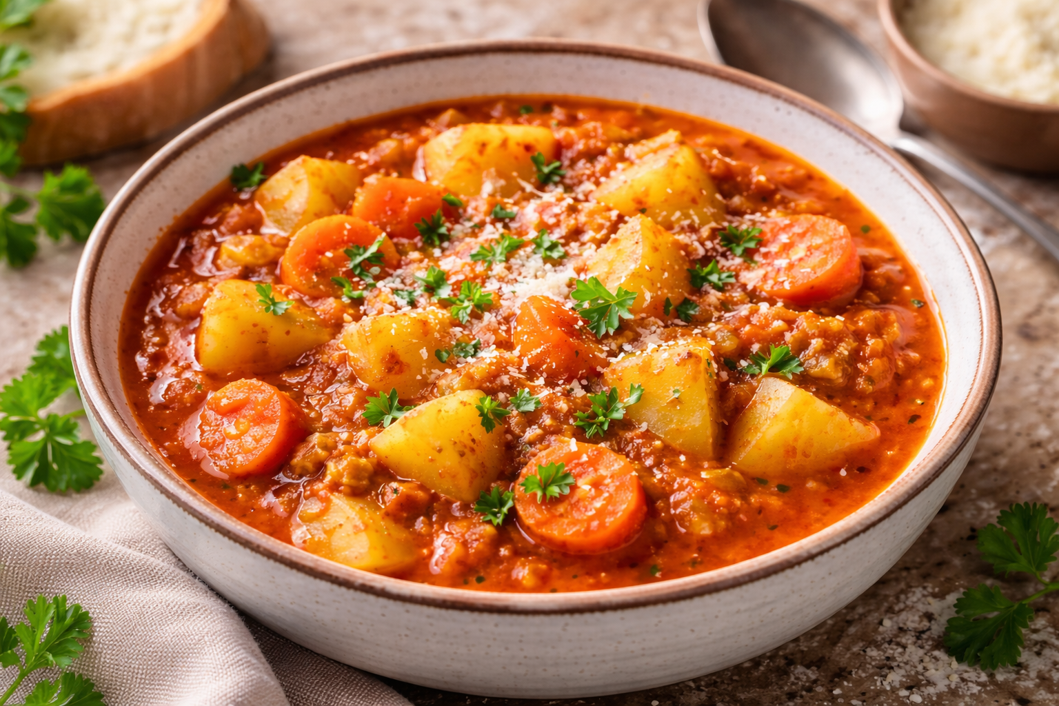 Potrebovali boste nekaj korenja in krompirja, čebulo, pelate ter osnovne začimbe. Vse skupaj skuhate v enem loncu, pustite, da se lepo zgosti, nato pa jed postrežete samostojno ali s kosom kruha. In to je vse – zelo enostavno kosilo, za katero ne boste porabili več kot 2 evra.