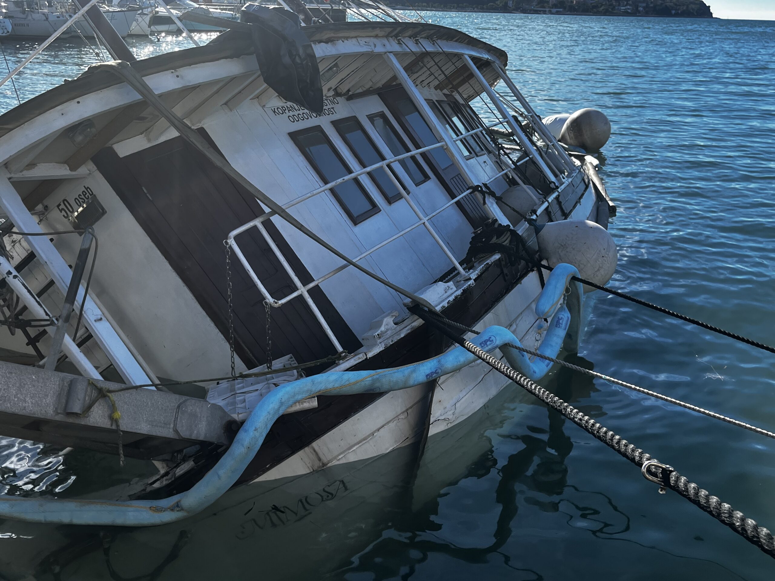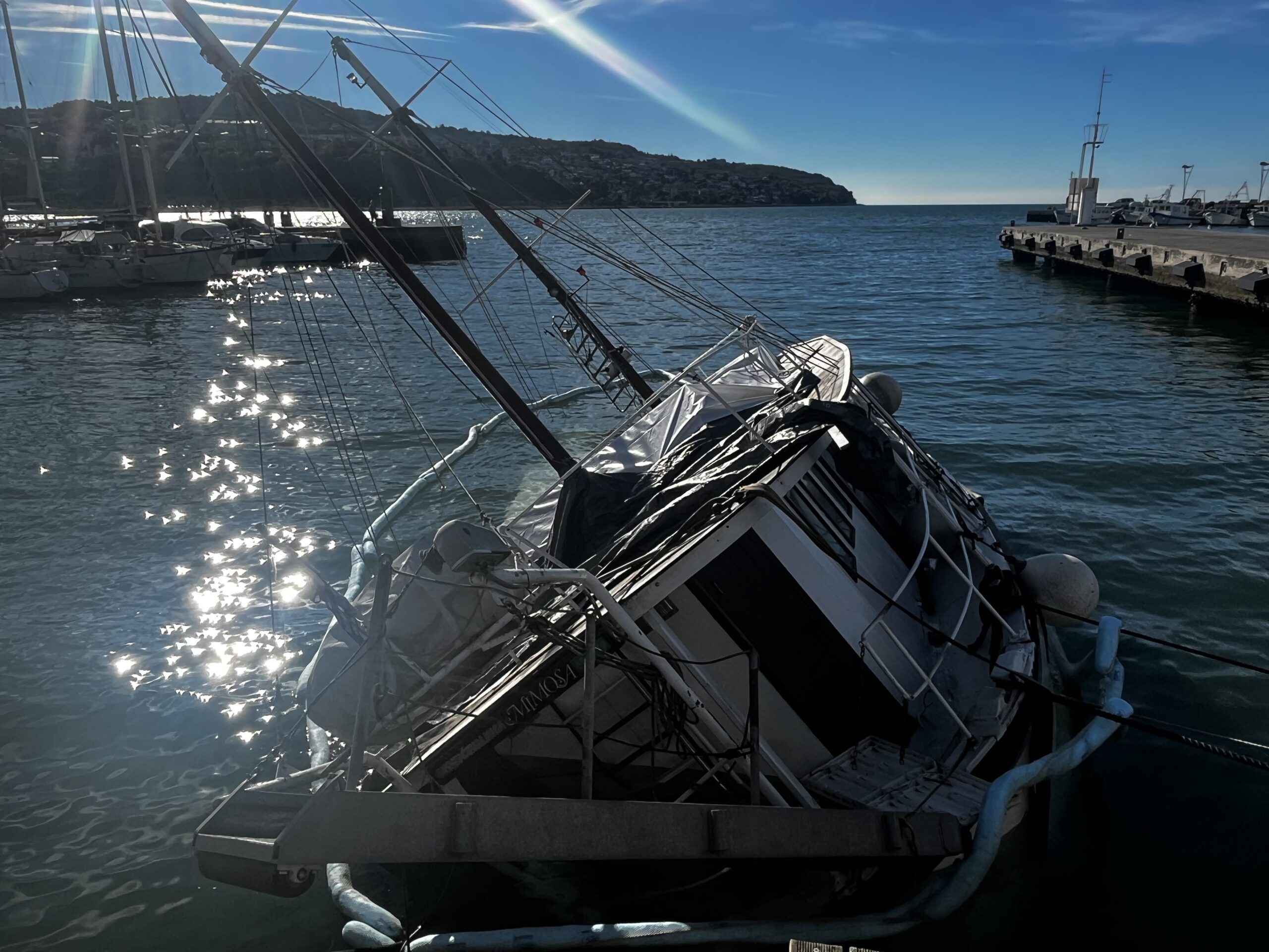 Danes se je v koprski marini potopila barka, ki jo je z Ukmarjevega trga mogoče videti, kako se je po levi strani nagnila in delno potopila v morje.