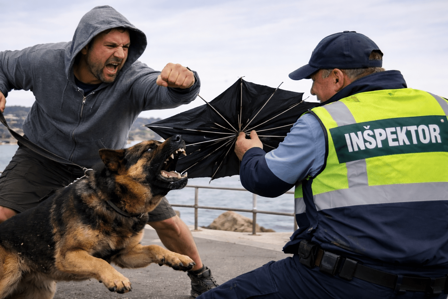 Veterinarski inšpektorji so na območju Žusterne posredovali zaradi psa, ki naj bi v preteklosti že večkrat napadel mimoidoče. Med uradnim postopkom je lastnik psa fizično napadel enega izmed inšpektorjev, ga odrinil in spravil na tla, proti drugemu pa se je agresivno odzval z brcanjem ter mu zlomil dežnik.