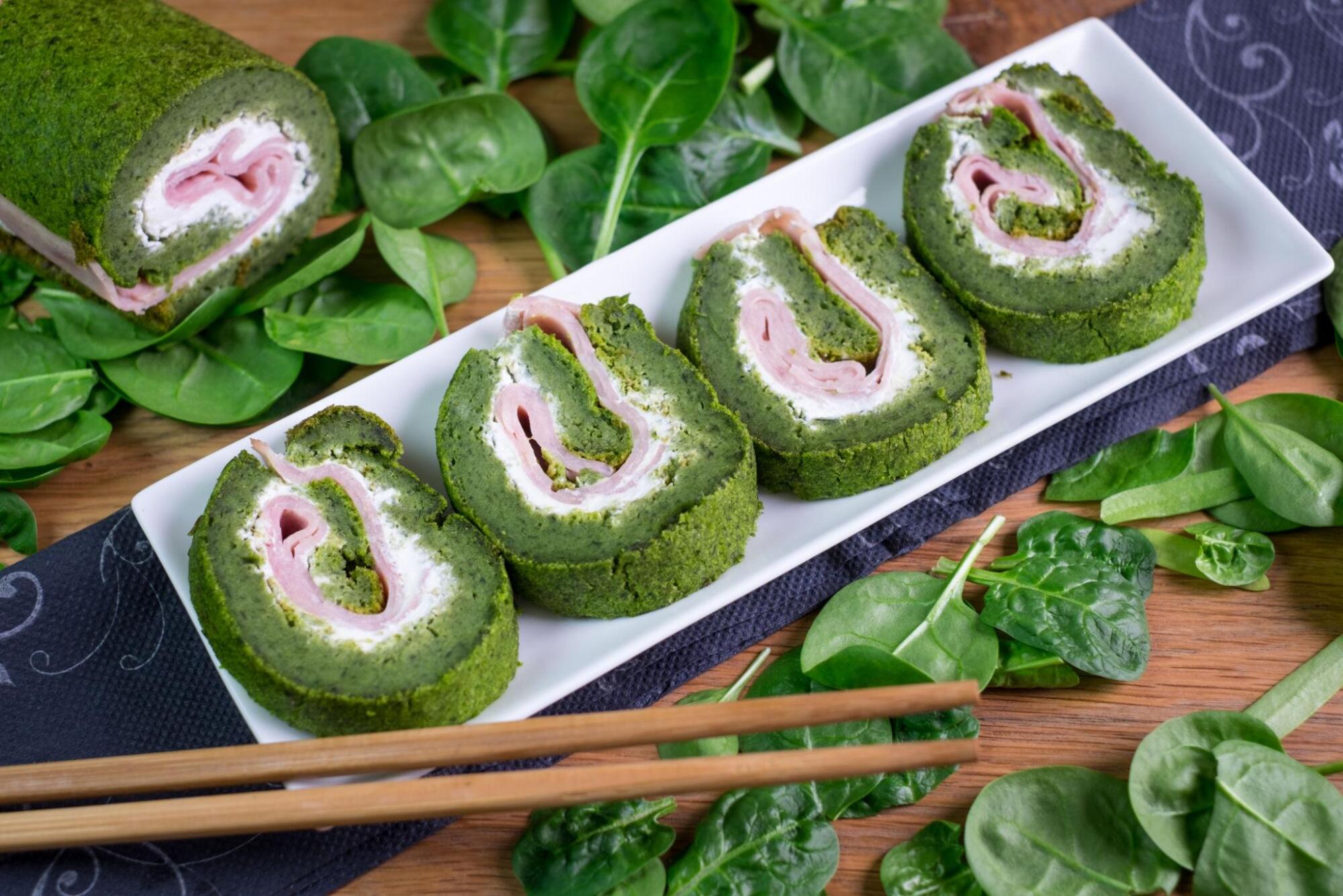 Ko je biskvit pečen, ga skupaj s papirjem še toplega zavijte v rolado in pustite, da se ohladi. Ohlajen biskvit previdno odvijte, premažite s kremnim sirom in po celotni površini obložite s šunko.