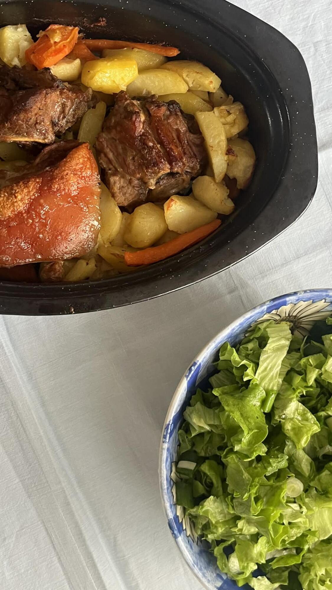 Jed je najboljša sveže iz pečice, ko je meso še sočno, zelenjava pa lepo zapečena. Odlično se ji poda preprosta zelena solata, ki s svojo svežino lepo uravnoteži bogat okus pečene svinjine.