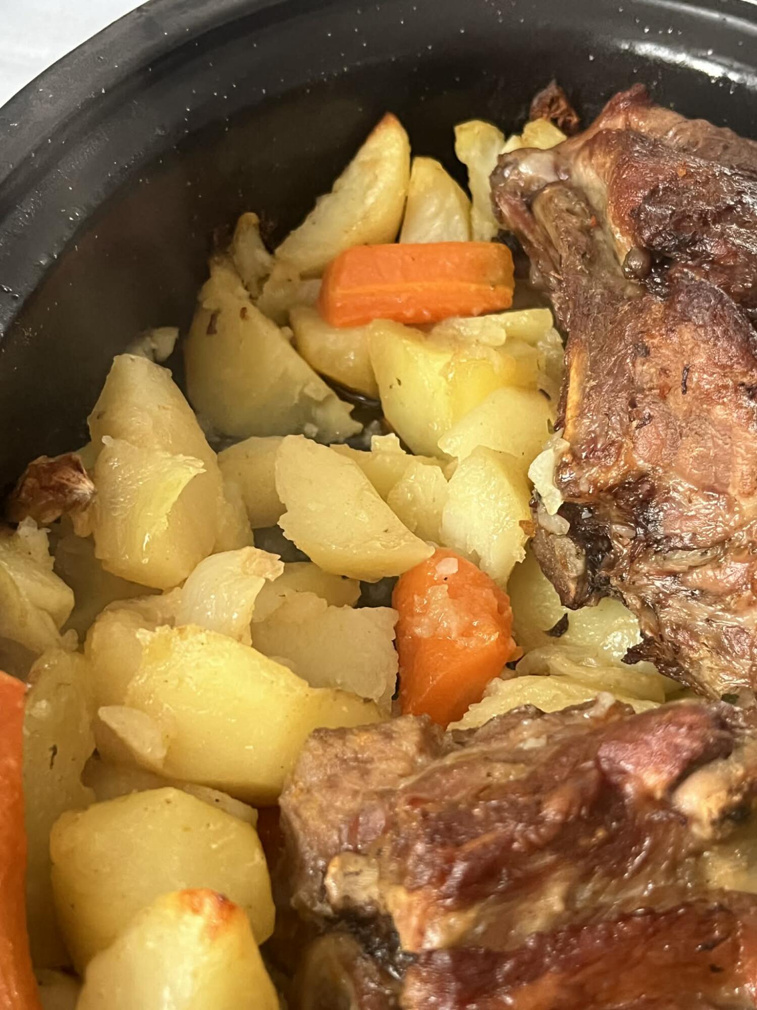 Pecite v predhodno ogreti pečici na 180 °C približno 1,5 ure. Med peko jed po potrebi premešajte ali prelijte s sokom iz pekača. - Zlata skorjica