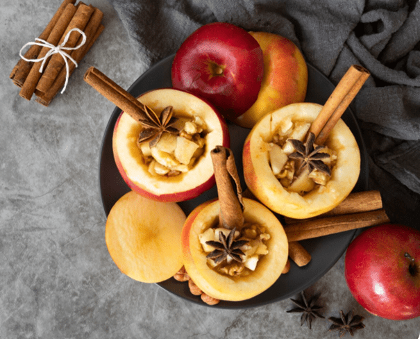 Z dobljeno zmesjo napolnite jabolka in jih po vrhu potresite s cimetom. Položite jih v ognjevarno posodo in pecite 25–30 minut, dokler ne postanejo mehka in zlato zapečena.