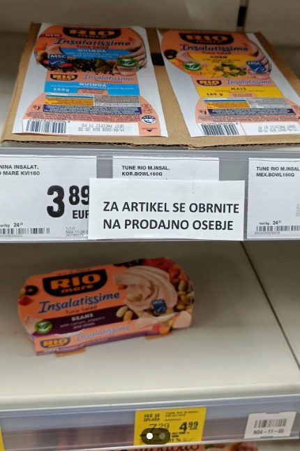 Namesto konzerv tune se v zadnjem času na policah nekaterih trgovin pojavlja napis strankam, naj se za artikel obrnejo na prodajno osebje.